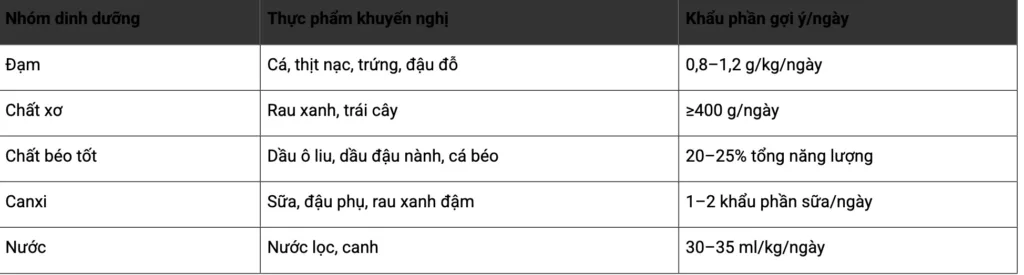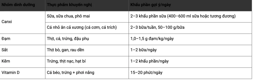 Song song với đó, chế độ dinh dưỡng cần đáp ứng đầy đủ nhu cầu năng lượng theo lứa tuổi và mức độ hoạt động, trong đó tinh bột lành mạnh nên chiếm khoảng một nửa tổng năng lượng khẩu phần. Chất đạm từ thịt, cá, trứng, sữa, đậu đỗ đóng vai trò quan trọng trong phát triển cơ bắp, trong khi canxi, vitamin D, sắt và kẽm cần được bổ sung đầy đủ để hỗ trợ hệ xương và tăng cường miễn dịch. Một chế độ ăn uống hợp lý sẽ giúp trẻ khỏe mạnh, nhanh nhẹn, học tập hiệu quả, đồng thời hình thành thói quen vận động tích cực và bền vững cho tương lai.