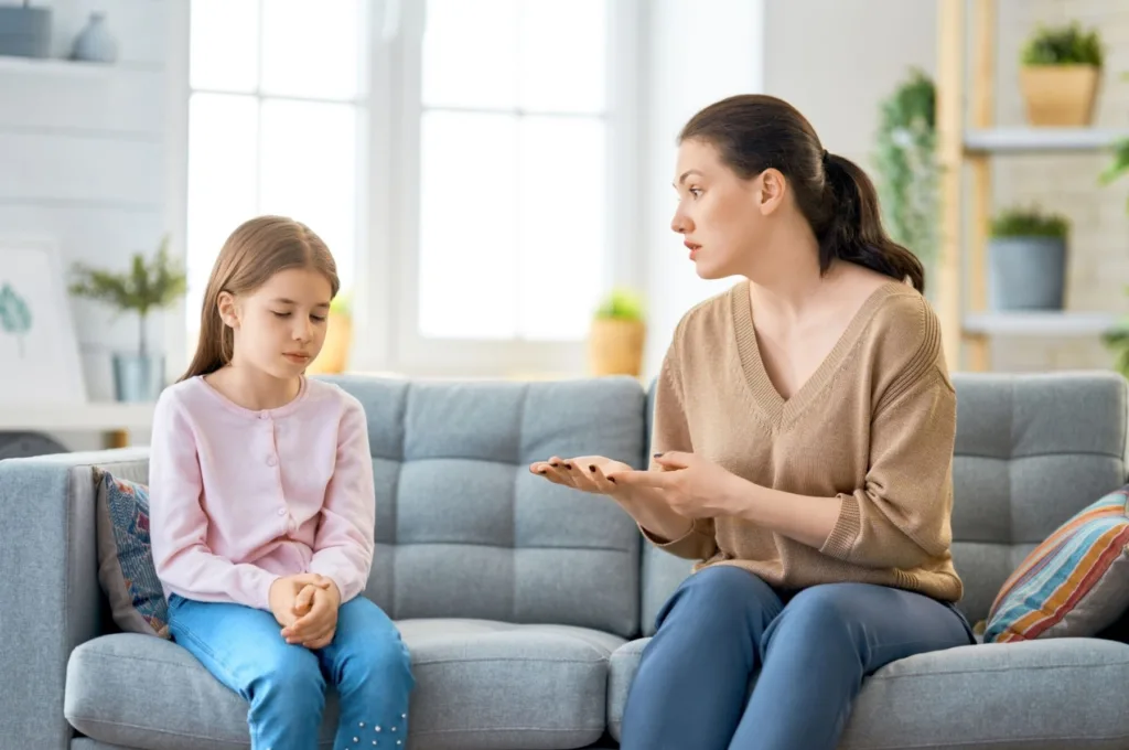 Giao tiếp bằng sự thấu hiểu: Thay vì quát mắng, hãy nhẹ nhàng hỏi con và lắng nghe để trẻ cảm thấy được lắng nghe và học cách biểu đạt cảm xúc bằng lời nói. Nói một cách nhẹ nhàng, nếu con không hiểu hãy minh họa rõ hơn cho con hiểu.