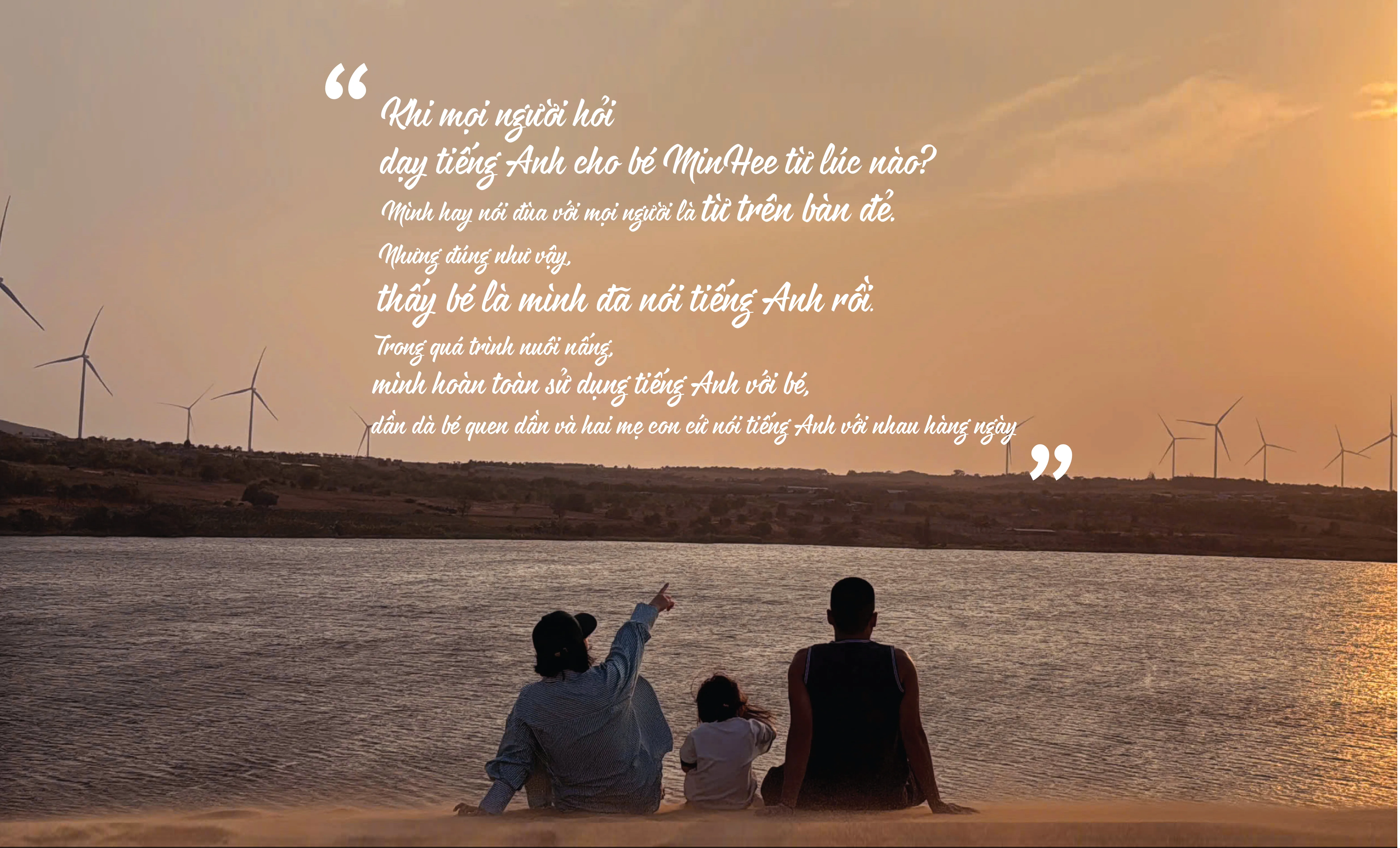Người mẹ 9x Quỳnh Anh cho biết, đã sử dụng phương pháp “one parent one language”, tức một người sẽ nói hoàn toàn tiếng Anh với con, và người còn lại sẽ nói với con bằng tiếng Việt trong đời sống hàng ngày. Do vậy, MinHee vừa sành sỏi tiếng Việt, lại thông thạo tiếng Anh. Phản xạ nói 2 ngôn ngữ trong gia đình dần dà trở thành một thói quen riêng của bé.