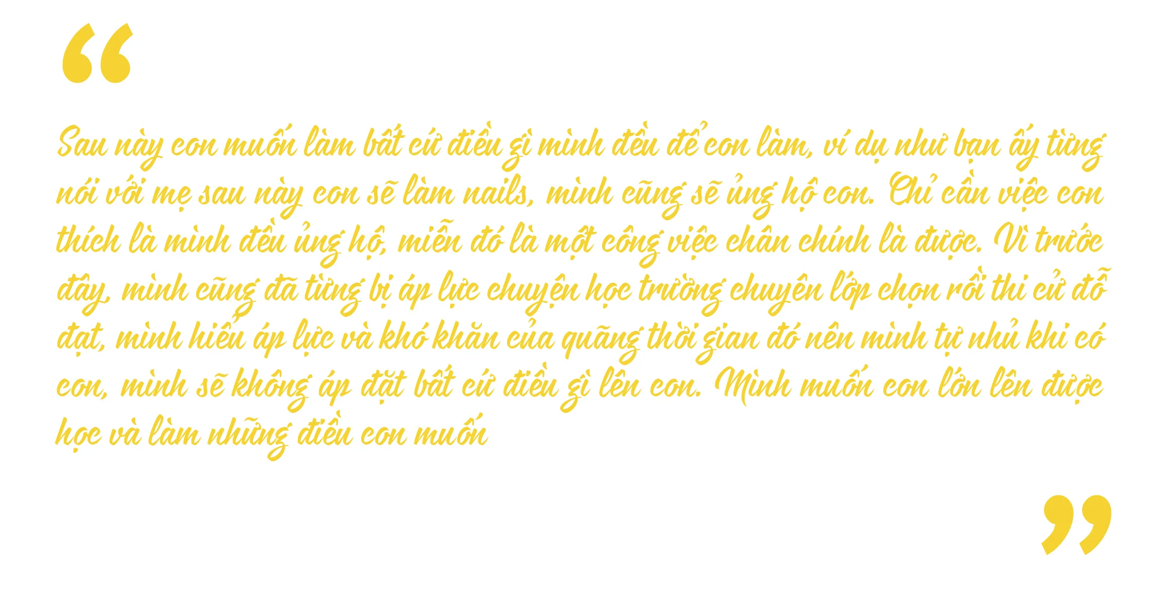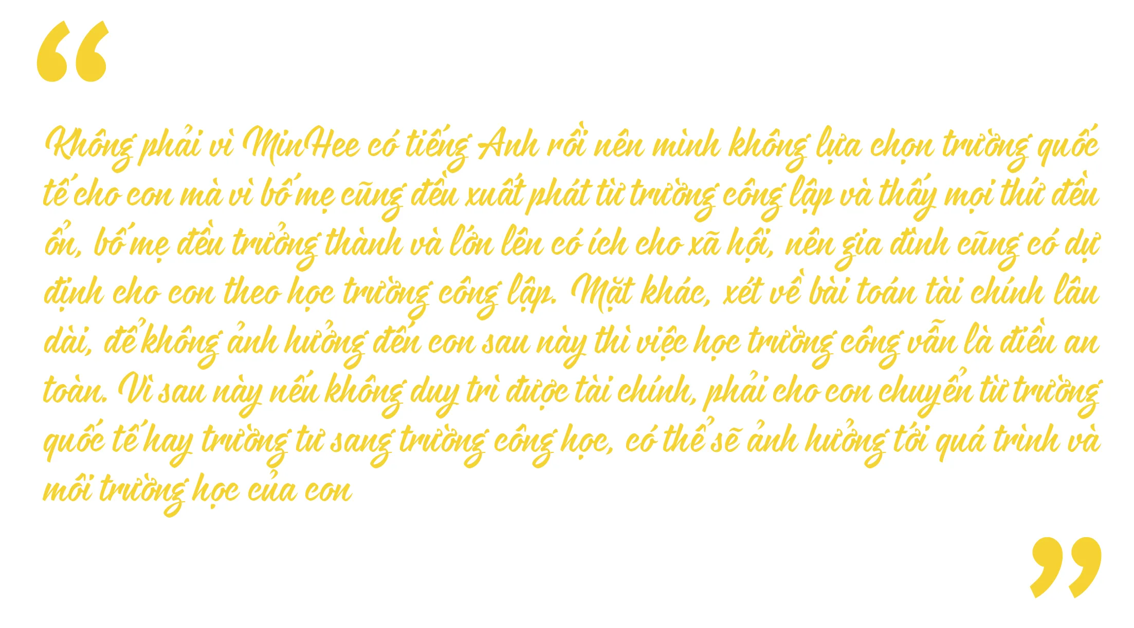 Do đó, khi chọn trường cho con, người mẹ trẻ 9x cũng không đặt nặng phải học trường quốc tế hay một ngôi trường đào tạo những “siêu sao”. Cô chọn cho con mình một ngôi trường bình thường, ở đó thầy cô đối xử công bằng với con như bao bạn bè khác. Năm sau MinHee lên lớp một, Quỳnh Anh cũng đang cân nhắc lựa chọn trường công cho con theo học. Bởi, trường công ở Hà Nội hiện cũng tốt cả về cơ sở vật chất lẫn chất lượng giảng dạy. Bên cạnh đó, cô cũng muốn con mình bình thường nhất như bao bạn bè cùng trang lứa khác.